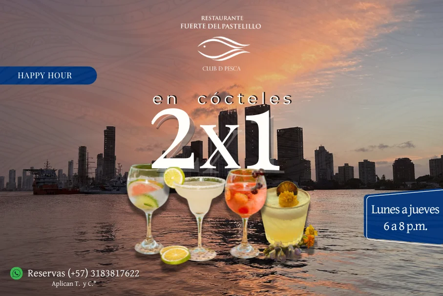 ¡Ven a disfrutar del mejor after hour en el Fuerte del Pastelillo de lunes a jueves desde las 6 p.m a 8 p.m.! En nuestro exclusivo ambiente podrás tomar cócteles refrescantes con tus amigos mientras admiras la hermosa vista de la bahía de Cartagena. ¡No pierdas la oportunidad de vivir esta experiencia única!