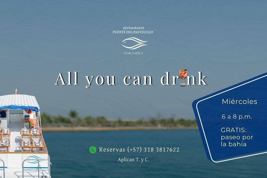 Todos los miércoles podrás disfrutar nuestra nueva oferta All you can drink disponible de 6 a 8 p.m. y paseo por la bahía gratis Incluye: 🍸🍺🍷Bebidas ilimitados por 2 horas entre cocteles, vinos y cervezas seleccionadas. 🛥Paseo gratis de 15 minutos por la bahía.